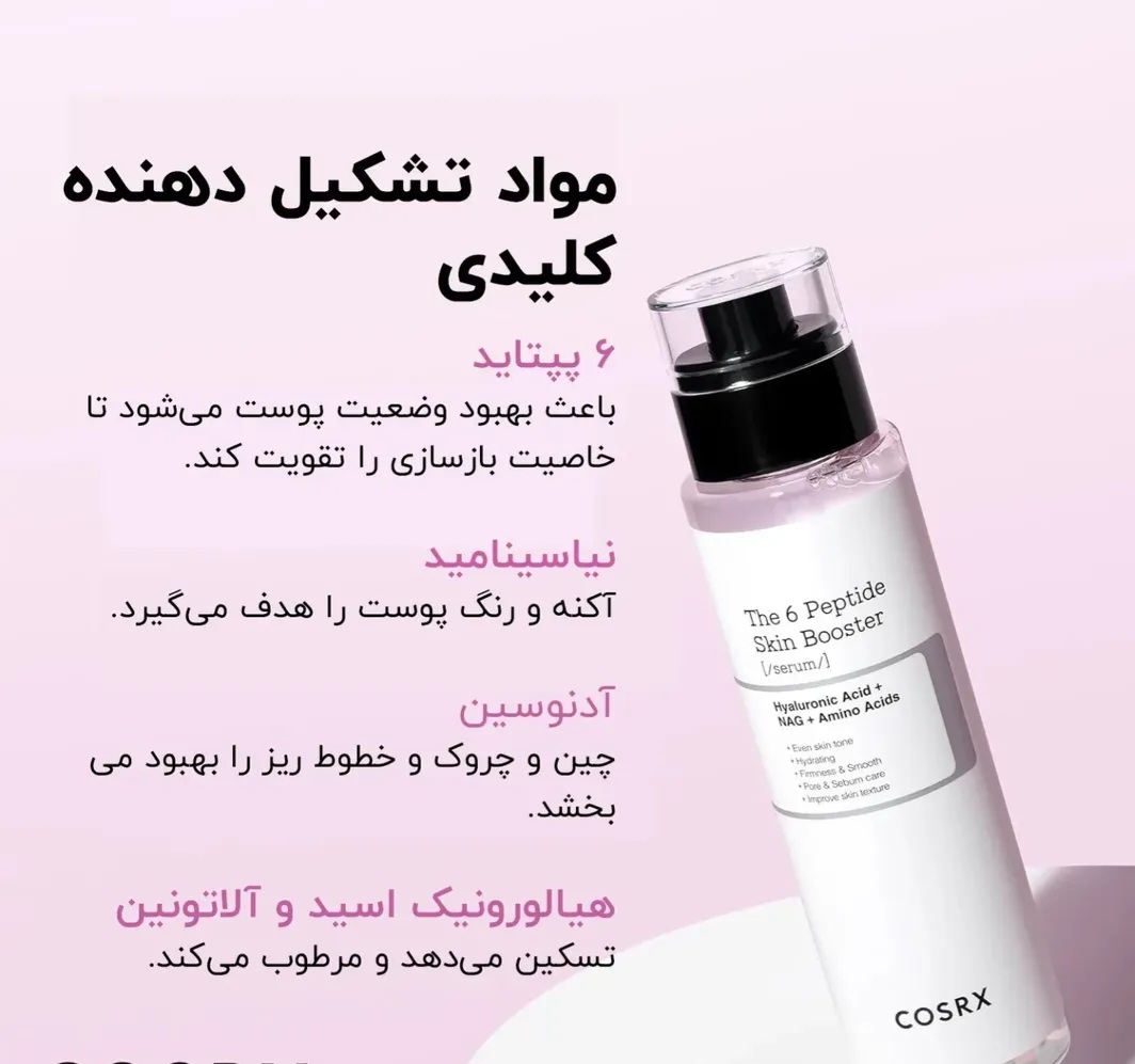 سرم پپتاید حاوی 6 مولتی پپتید و جزو محصولات آبرسان و مرطوب کننده برای پوست محسوب میشود که وضعیت کلی آن را بهبود بخشیده و موجب کاهش سایز منافذ باز میشود. پوست را سفت کرده و موجب کاهش خطوط ریز و اولیه میشود. سرم ۶ پپتاید کوزارکس بافت و رنگ پوست را هموار و یکدست کرده و تسکین دهنده و تقویت کننده است. یک انتخاب عالی برای مرحله اول روتین پوستی میباشد و برای انواع پوست مناسب است؛ همچنین در تمام طول روز و هر فصلی قابل استفاده میباشد. سرم شش پپتاید کوزارکس بافتی آبکی، بسیار سبک و غیر چسبناک دارد و به خوبی پوست را تقویت میکند.